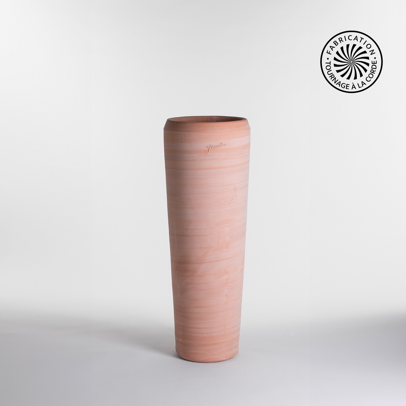 Le vase tube est fabriqué sur commande, au tournage à la corde, La structure cordée est d’abord positionnée sur un socle d’argile qui formera le fond du pot. L’argile est ensuite appliquée « au lancer » : cette technique consiste à projeter à la main des poignées de terre sur l’ensemble de la surface cordée. Enfin la paroi est lissée grâce à un gabarit extérieur.. Personnalisez votre Poterie selon votre goût avec différentes tailles, effets de textures ou couleurs de terres ou d’émaux.