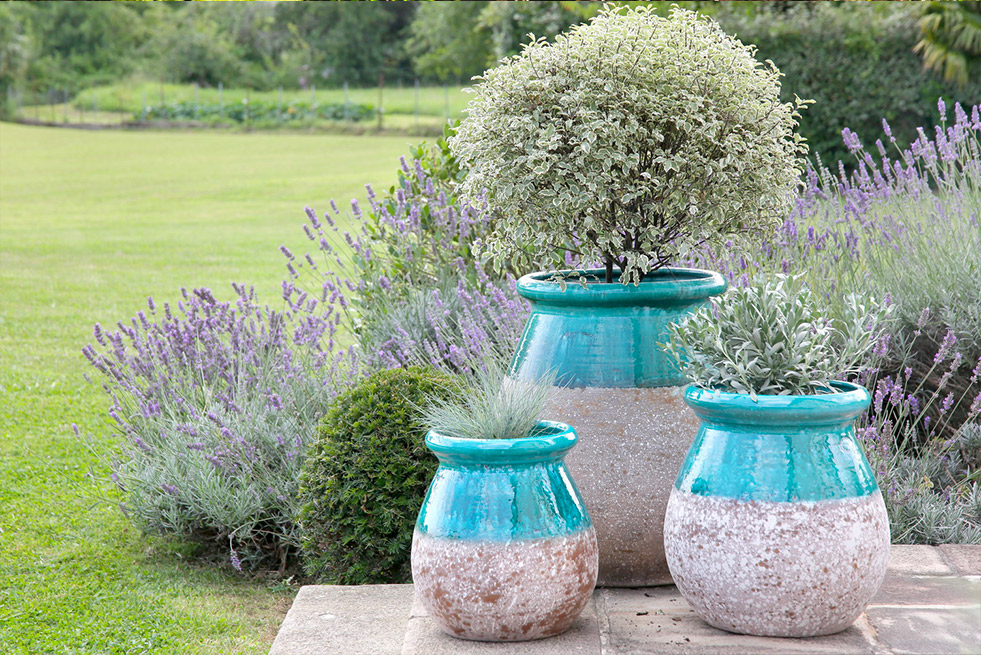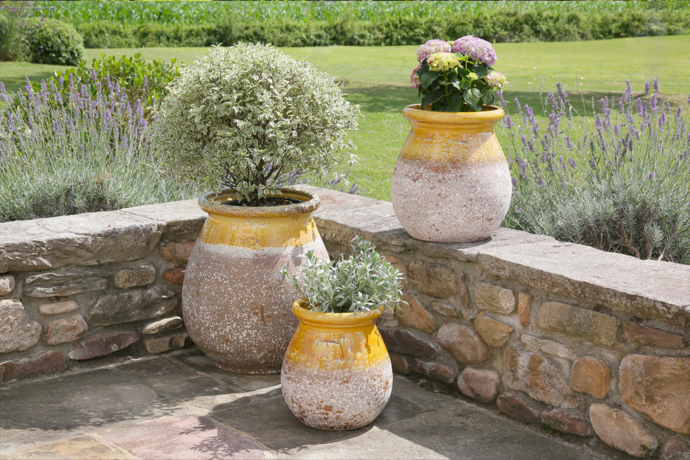 La jarre provençale est un classique de nos jardins et terrasses. Ses courbes généreuses rappellent les jarres anciennes dont l'utilisation était, à la base, alimentaires. Une poterie traditionnelle et typée qui nous transporte aux origines des contenants. Nous proposons une version col émaillé et vieilli en 2 couleurs : col vert et col miel. Les poteries émaillées peuvent rester à l’extérieur tout au long de l’année. Pensez à les protéger du gel.