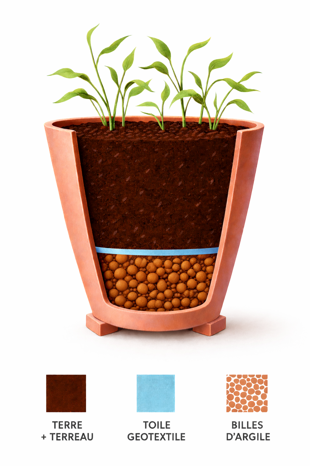 Nos poteries en terre cuite résistent au gel. Veuillez suivre les conseils de plantation que nous proposons comme indiqué dans le schéma ci-dessous.